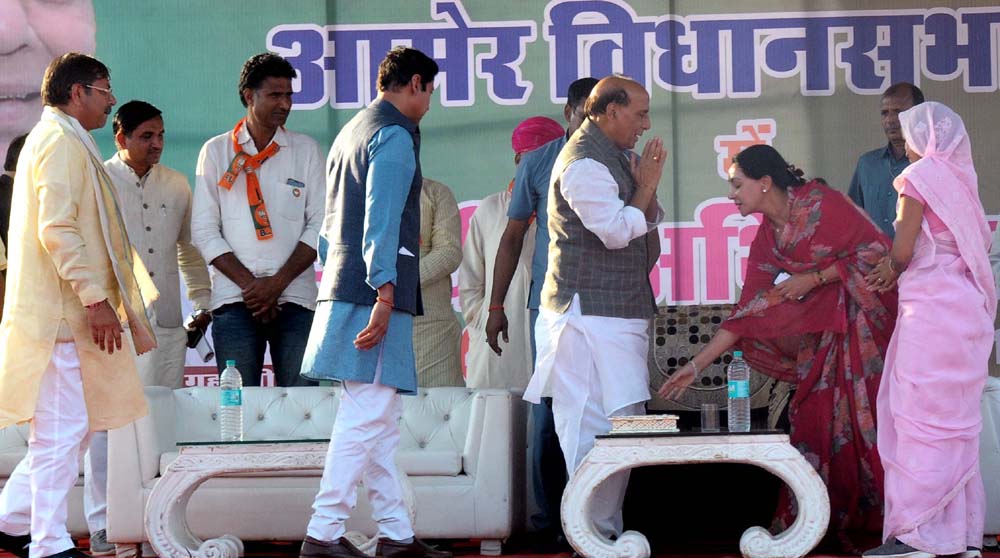 While, Rajnath Singh was seen blessing Jaipur Princess Diya Kumari, an MLA from Sawai Madhopur. However the erstwhile Royal will not be getting a ticket from BJP to contest the Assembly elections. Diya Kumari, had took on to the streets to protest against her own (Vasundhara Raje) government for one of her properties which had been undertaken by Jaipur Development Authority (JDA), which was directly under Chief Minister Vasundhara Raje. Since then things have not been smooth between the two. The increasing tension between the two is the reason behind Kumari not getting the ticket. However, her sharing stage with Rajnath Singh surprised many. But Vasundhara Raje was absent.