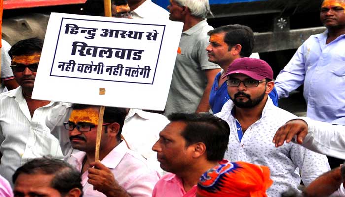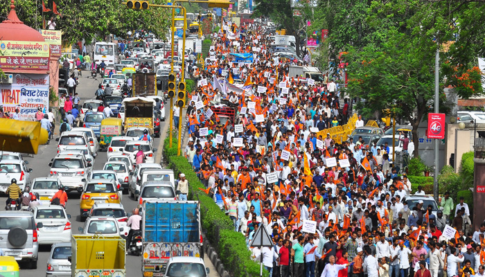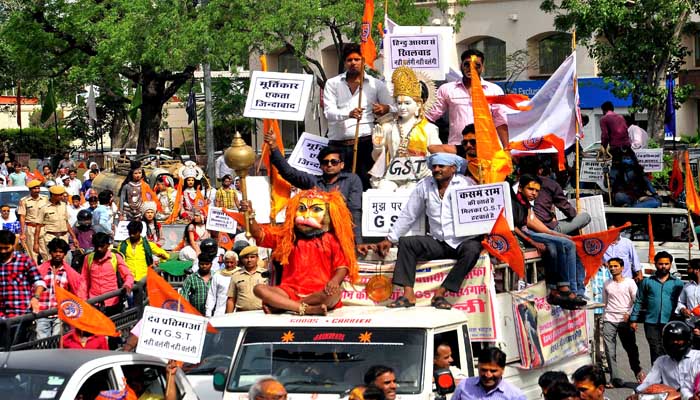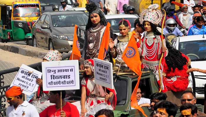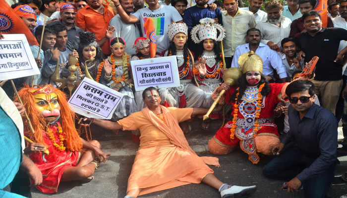 On July 5, hundreds of sculptors under the banner of Moortikala Sangharsh Samiti marched through the streets, protesting against idols made by them being brought under GST. Protesters dressed as gods, goddesses, and priests carried striking slogans such as “Kasam Ram Ki Khatey Hain, Milkar GST Hatayenge” (We swear in the name of Ram, together we will force GST to be rolled back). They argued that taxing idols of gods amounted to an attack on Hinduism.