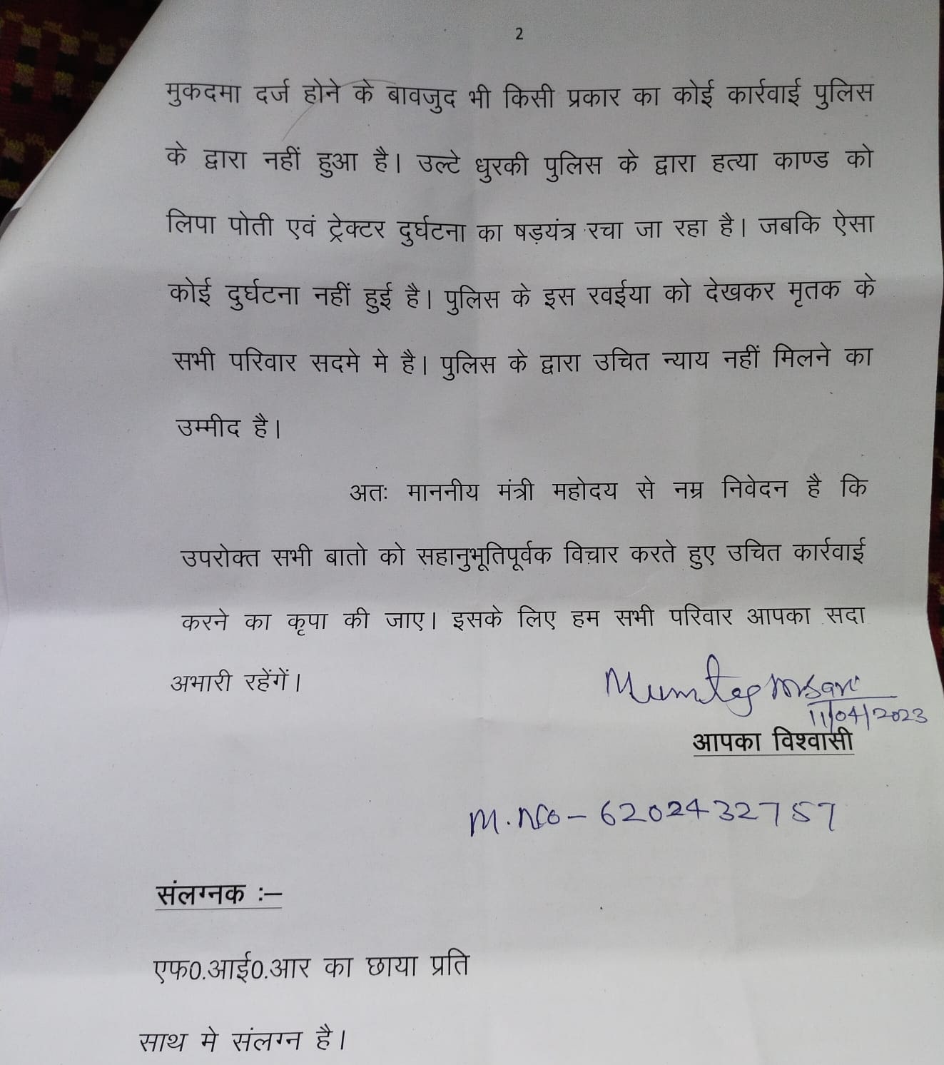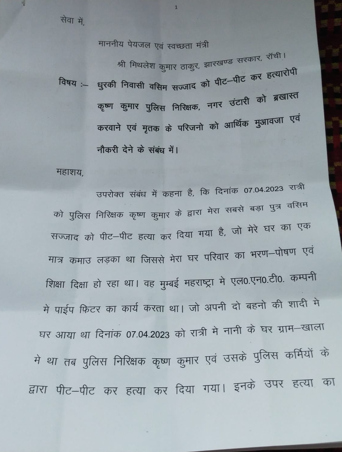 Mumtaz Ansari, father of Wasim Sajjad wrote to Hemant Soren’s cabinet minister and Garhwa MLA Mithilesh Thakur, who had intervened and helped register an FIR against the accused police inspector.