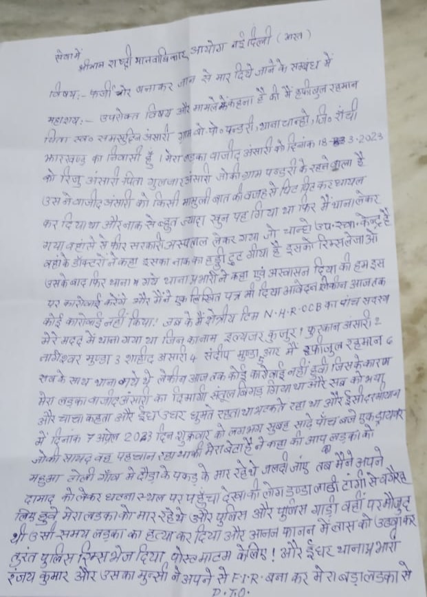 The father of Wajid Ansari, Hafizul Rehman wrote to the Human Rights Commission, Delhi seeking justice for his 21-year-old son, who was lynched within a kilometre of his village in the Chanho block of Ranchi on April 8, on suspicion of theft.