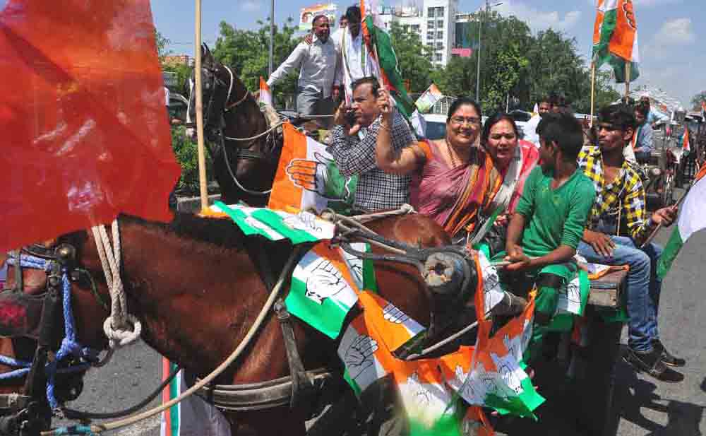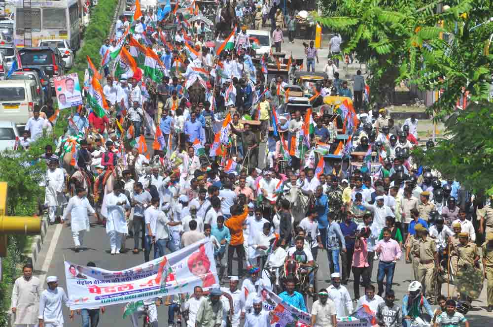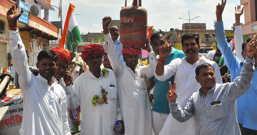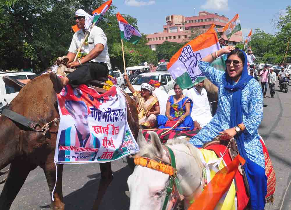 Jaipur: Rajasthan State Congress President, Sachin Pilot rode a bullock cart in Jaipur to protest the fuel price hike during the Bhartiya Janata Party (BJP) regime. He was accompanied by hundreds of other Congress party leaders and workers. Some rode on bullock carts, while some on carts pulled by camels or horses to register their protest. Significantly, women came saddled on horses during the protest rally. Some had also demonstrated with gas cylinders. Petrol is being sold at Rs 73.20 and diesel is at Rs 62.86 per liter in the Rajasthan state capital. “Before coming to power, BJP had promised that inflation would. However, when crude oil price is at lowest rate in international market, the price of petrol and diesel is at its highest in India,” Pilot said, as reported by PTI. Interestingly, before 2014, BJP leaders protesting with bullock cart and gas cylinders against the fuel price hike, was a regular sight, when United Progressive Alliance (UPA) government was at the center. However, the major protest against fuel price hike has been registered only by the Rajasthan Congress, while rest of India, party leaders and workers are yet to hit street over it. Picture credit: Chandra Mohan Aloria.